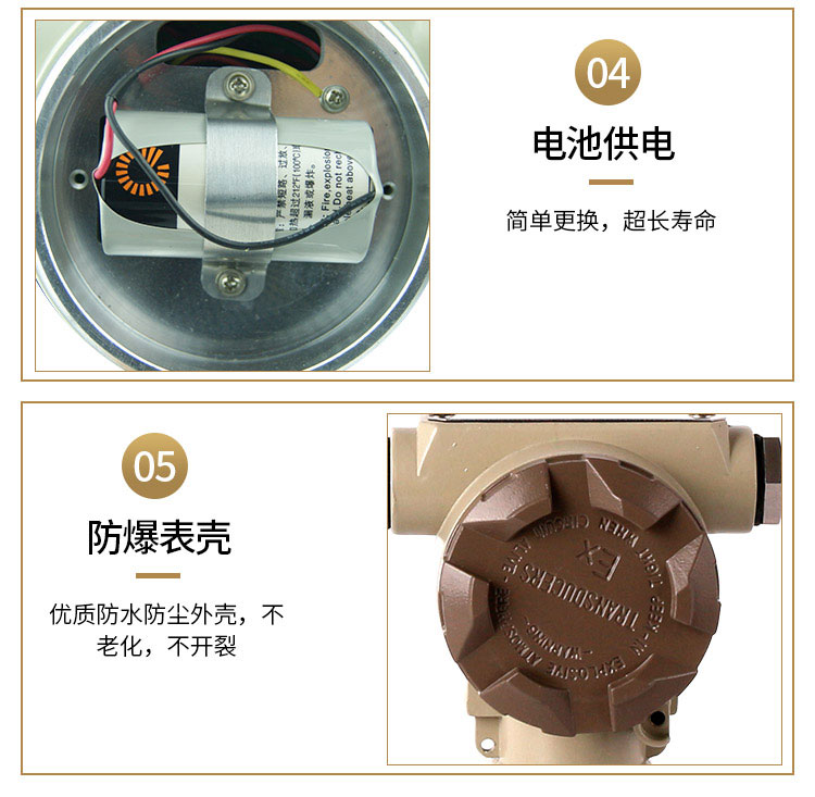 JJ-LWGY-A型:4-20mA变送器。说明:不带现场显示,输出4-20mA标准电流信号。标配为防爆型产品(ExdIIBT6,防爆证号:CE061580)。
