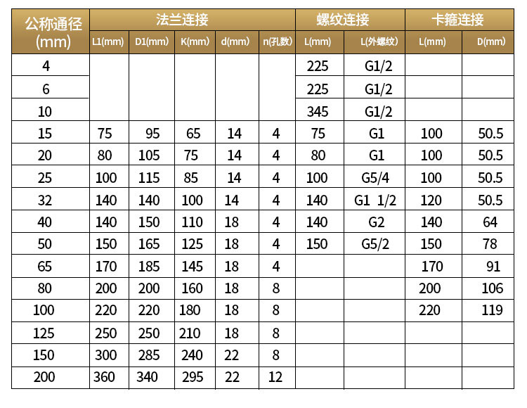 注:DN15~DN40常规为螺纹连接,如希望采用法兰连接,请在“公称通径”后加“(FL)”