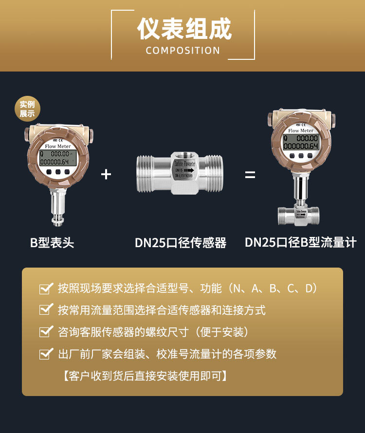 6、通过流量传感器的流量过大时,会使轴承寿命过短,通常通过阀门将流量调到合适大小,其阀门应安装在流量计的下游。