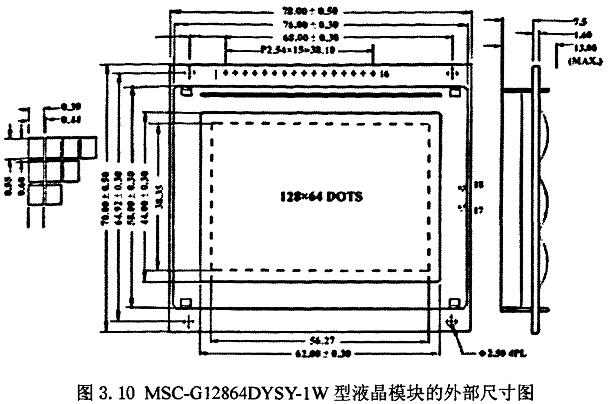 智能电磁流量计离不开良好的显示界面。我们采用128*64的图形点阵液晶显示模块来显示累积流量、瞬时流量等数据信息。液晶显示模块(LCM),是将液晶显示器件、驱动及控制电路、以及温度补偿、驱动电源、背光等辅助电路组合在一起的一种相对独立的显示器件和设备。通常液晶显示器件本身引线众多,而且要将这些引线与驱动、控制等电路连接才能用于显示信息,因此生产厂家在制造液晶显示器件的同时,也将与之对应的驱动、控制等电路做成PCB板,然后用压框和导带或导电橡胶将液晶显示器件固定在PCB板上,从而组合形成液晶显示模块。图3.10是我们采用的MSC.G12864DYSY-1W型液晶模块的外部尺寸图。