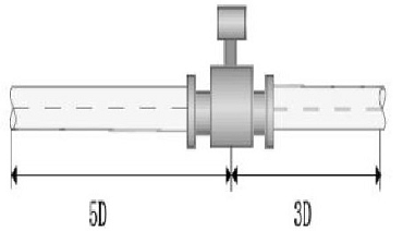 4)电磁流量计对直管段长度有明确要求(D为流量计内径).对于90°弯头、T行三通、异径管、全开阀门等流体阻力件,离电磁流量计的电极中轴线至少5D直管段;对于不同开度阀门(比如调节阀),则上游侧直管段长度需要10D;一般传感器下游的直管段只需要3D即可.