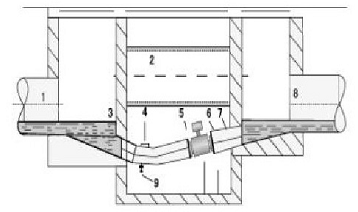 8)电磁流量计如果必须倾斜安装时,必须安装在流体上升管道,在开口排放的管道安装时,必须安装在管道的较低处.如图:1-入口 2-溢流口 3-入口 4–清洗口 5-流量计 6-短管 7-出口 8-排污口 9-排污阀